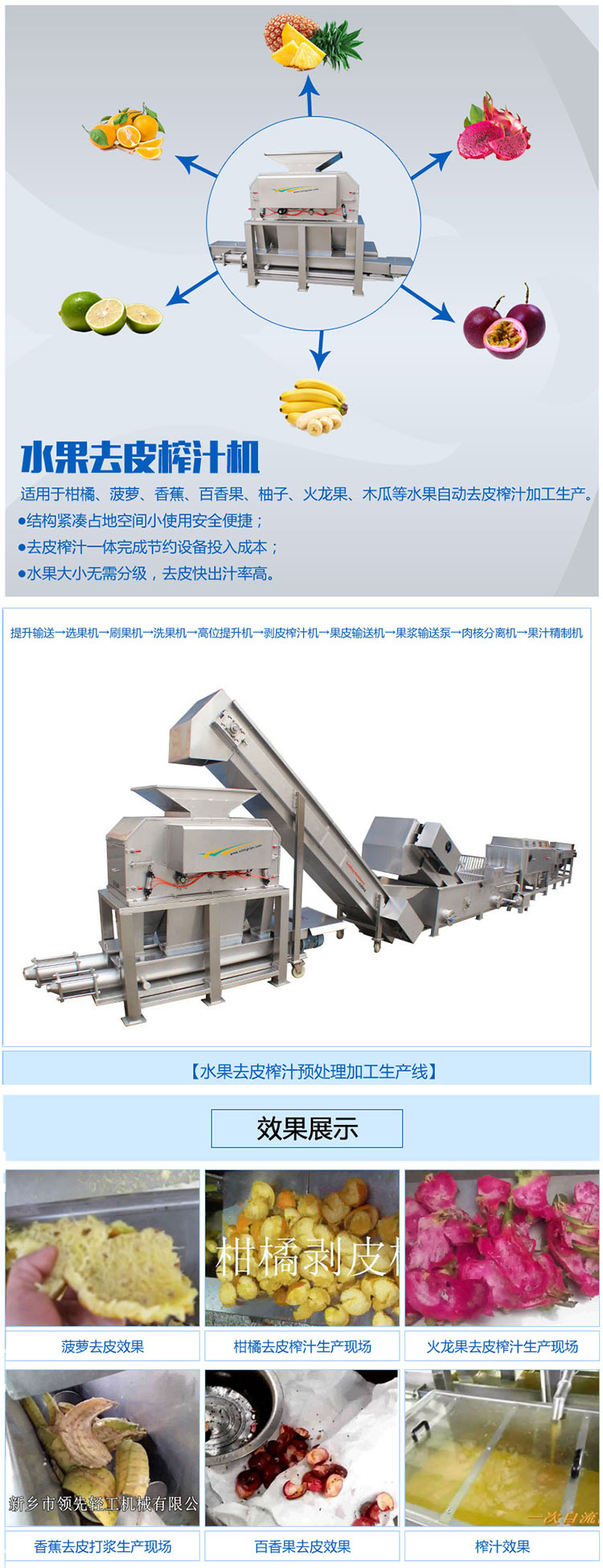 宁夏柑橘剥皮榨汁机是结合外国一些成熟的技术和设备的优点研制而成的,可以集去皮,榨汁为一体的设备,使用非常方便。该设备的生产效率高,不需要进行分级处理,产量达,每小时高达8-10吨的产量。